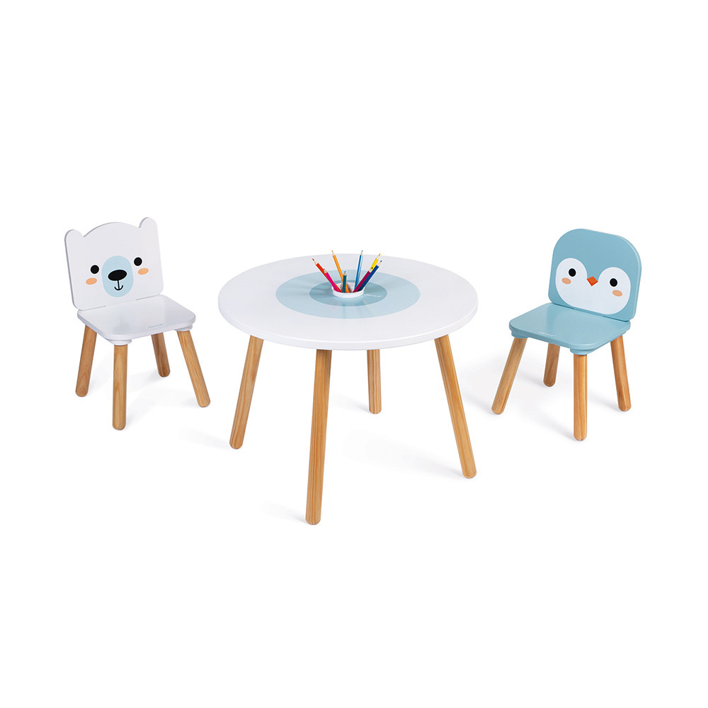 ¡Nos vemos en el Polo Norte! Este bonito conjunto de mesa y dos sillas de madera de colores polares derretirá a tus hijos. Pasarán horas dibujando y jugando a sus juegos favoritos. Incluso podrán tomar el té con su peluche favorito o contar a sus hermanos o hermanas todas las historias que se les ocurran. Esta mesa es fácil de transportar y se puede instalar fácilmente en el dormitorio, la sala de juegos o el salón para estar más cerca de mamá y papá. Este conjunto se ajusta a la altura de los niños a partir de 3 años. La mesa tiene un diámetro de 60 cm y una altura de 47 cm. Las sillas miden 49 cm de altura y la altura del asiento es de 26 cm. En el centro de la mesa hay un portalápices extraíble para guardar fácilmente los rotuladores y lápices de colores.