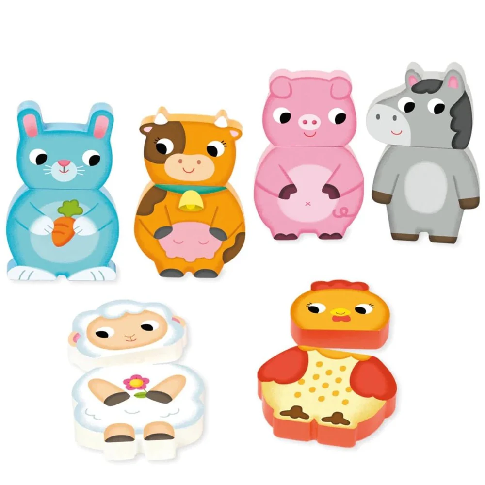 Cambia la cabeza y el cuerpo encontrando diferentes combinaciones de los animales de la granja. Las piezas están imantadas, no es necesario que encajen perfectamente para que produzca la unión, por eso lo recomendamos desde los 12 meses.