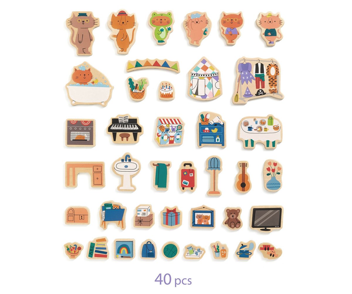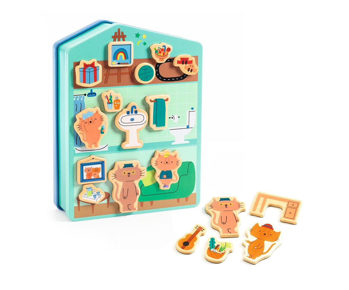 Divertida caja de metal en forma de casita, en su interior contiene 40 piezas magnéticas de madera para crear diferentes escenas de hábitos de rutina diaria. Con 6 gatos diferentes, podrás recrear historias únicas en ambas caras de la casa, estimulando la creatividad y la imaginación.