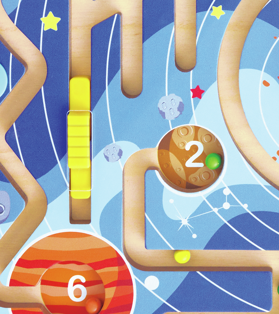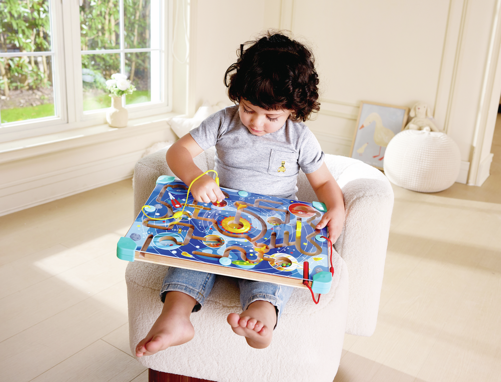 Un tablero de juego interactivo y multifuncional que combina lógica espacial, creatividad y motricidad fina en un diseño compacto. Un lado presenta un laberinto magnético con temática espacial, donde los niños guían cuentas de colores por los recorridos usando un lápiz magnético. Al darle la vuelta, se convierte en un rompecabezas tangram progresivo con una pizarra para dibujar y diseñar. Incluye cartas de desafío y un libro de actividades con 150 tareas, lo que fomenta el reconocimiento de formas, la coordinación mano-ojo y la resolución de problemas, todo mientras los niños se mantienen entretenidos con un juego abierto y creativo.