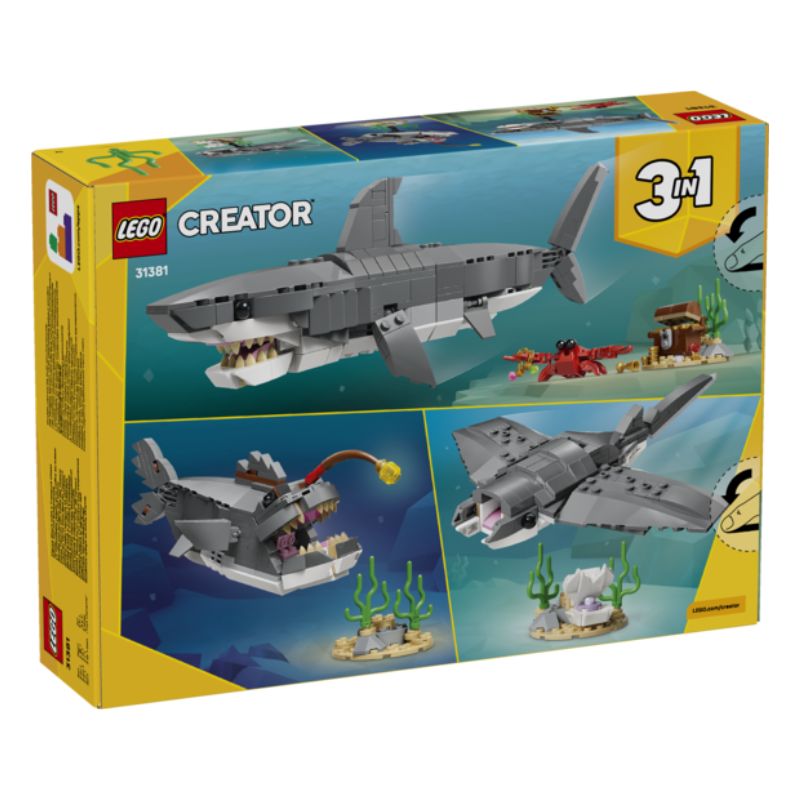 3 ANIMALES MARINOS DE JUGUETE EN 1: El juguete LEGO® Creator “3 en 1” Feroz Tiburón con Cofre del Tesoro (31381) para niños y niñas a partir de 8 años les permite construir y reconstruir 3 figuras de animales del océano con los mismos ladrillos