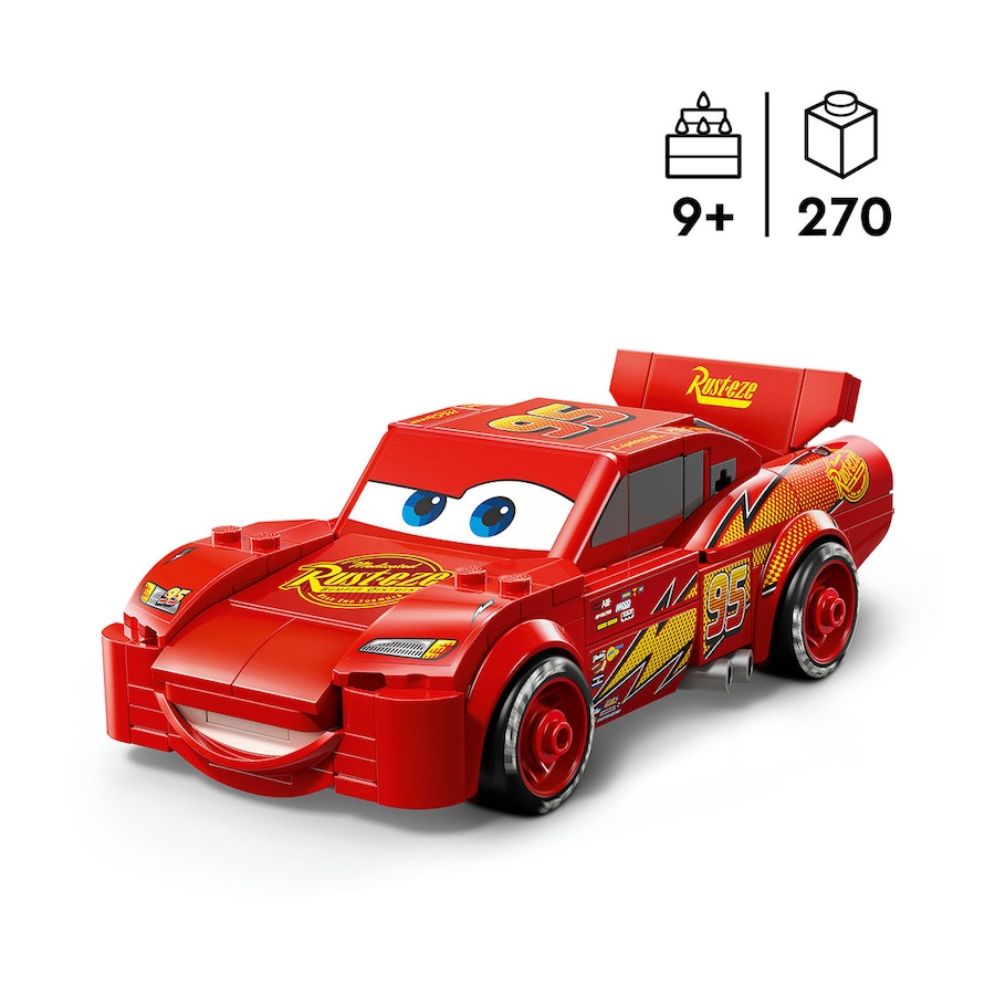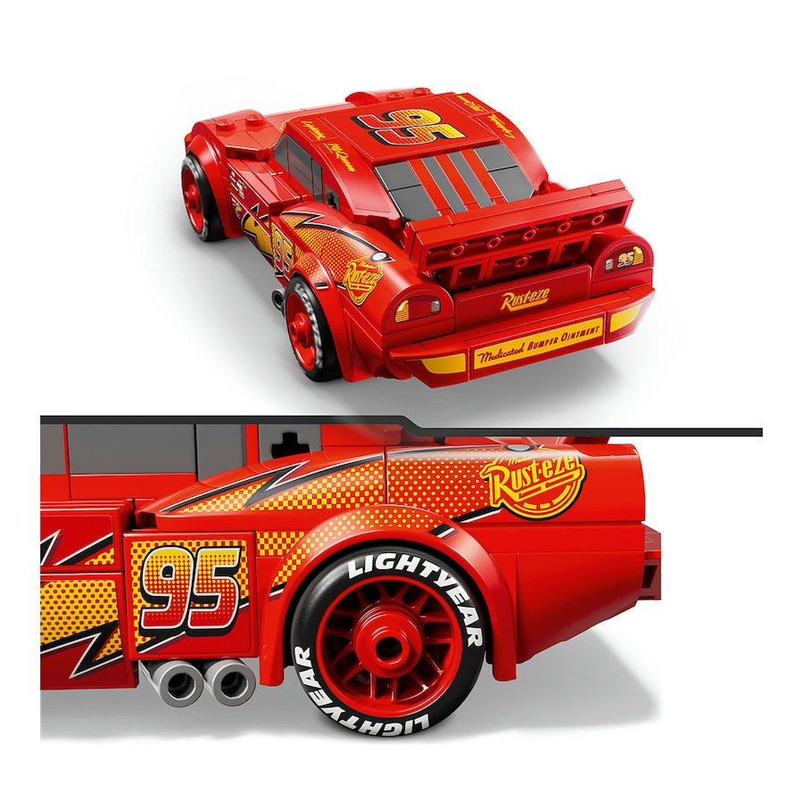 Juego de construcción de LEGO que celebra el 20 aniversario de la película Cars de Disney Pixar. Incluye detalles del personaje, como el rayo amarillo y naranja, el número 95 y el logo del patrocinador Rust-Eze. Presenta neumáticos impresos y pegatinas que representan faros. Este modelo destaca por sus bajos detallados.