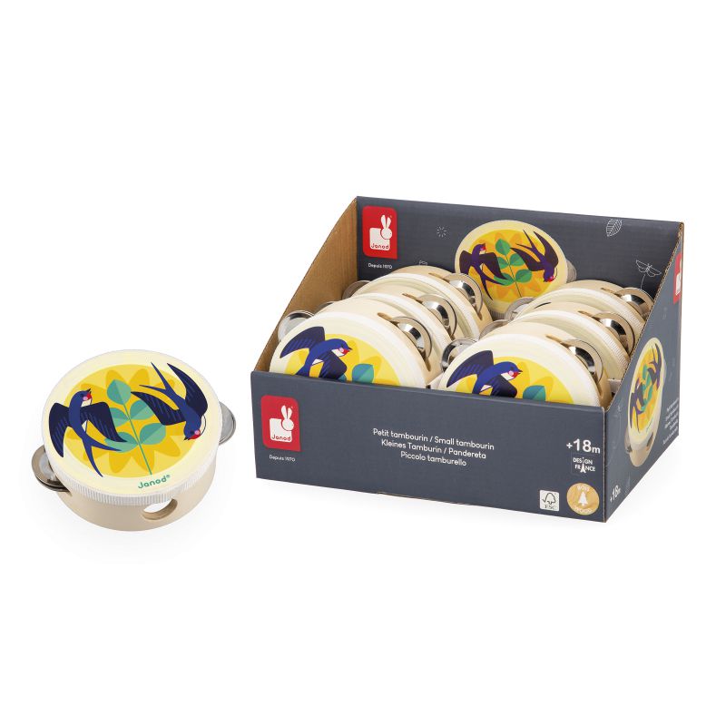 ¡Esta pandereta de alegres colores estimulará su sentido del ritmo! Se puede utilizar de dos formas: sacudiéndola para hacer sonar los platillos o golpeando la piel del tamborcillo. Ideal para desarrollar el sentido musical. Juguete de estimulación musical de madera FSC para niños a partir de 18 meses.