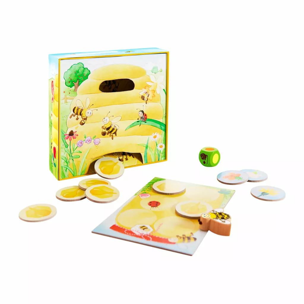 Contenido del juego: 1 colmena en 3D, 1 abeja Adela, 10 fichas de flores, 1 tablero, 1 dado, 1 instrucciones del juego.