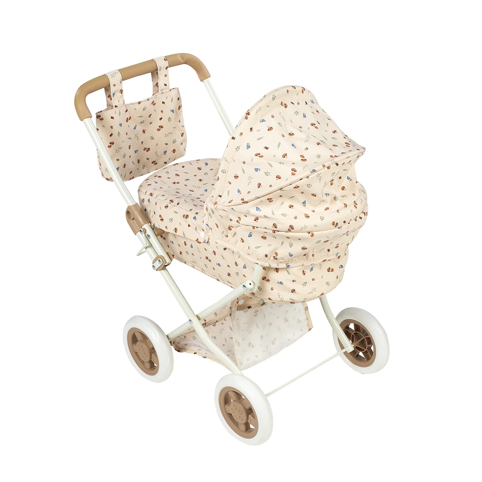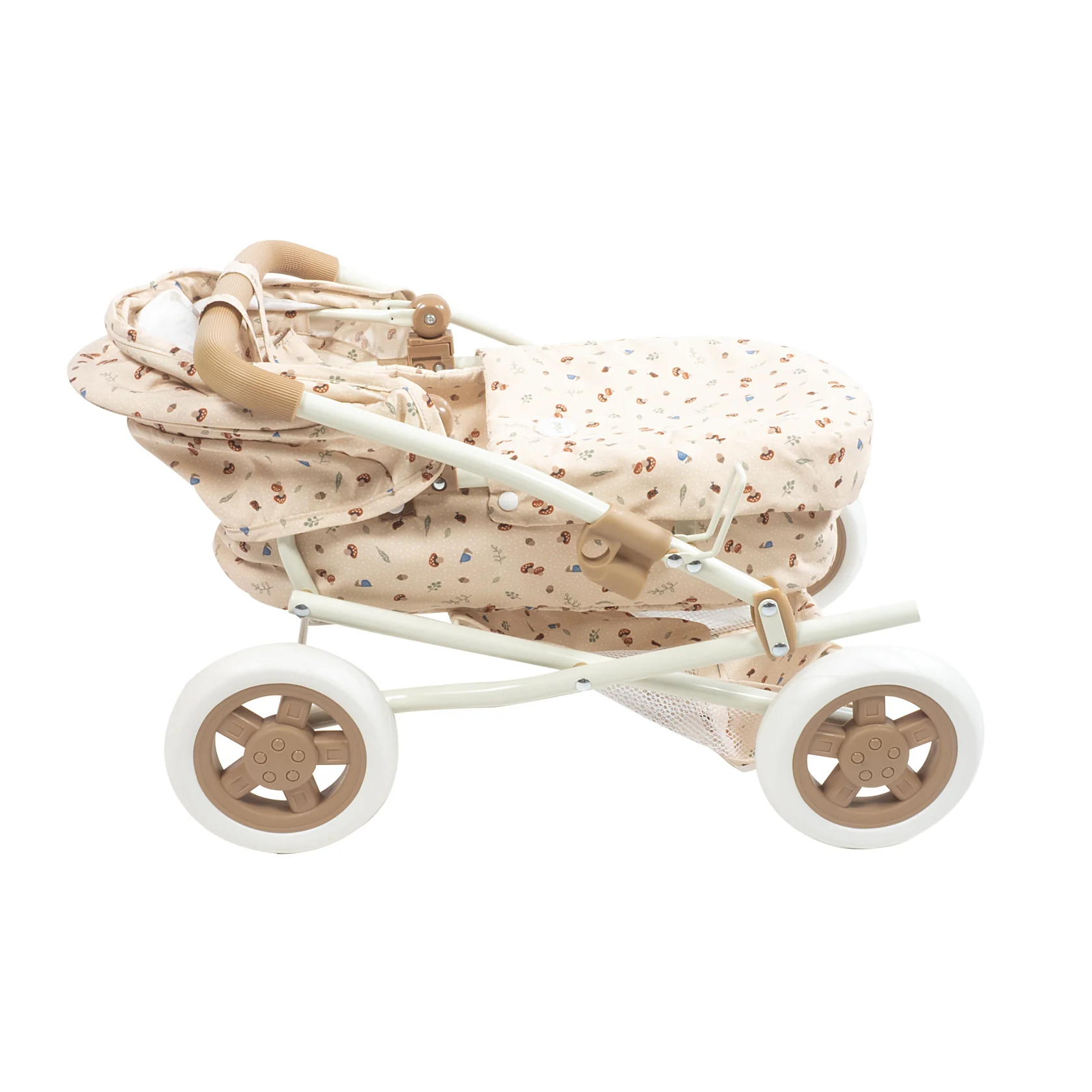 Carrito cuco de paseo con estampado neutral y con elementos relacionados con la naturaleza. Fácil y rápido de montar, con estructura metalizada plegable y muy resistente, cómodo manillar y bolso de paseo. El muñeco que puede ir en el cuco puede medir entre 30 y 42 cm. El capazo, la canastilla y el bolso canastilla de paseo se retiran fácilmente para poder lavar a máquina. La altura del cuco es de 81 cm y se recomienda para niños de 3 a 4 años.