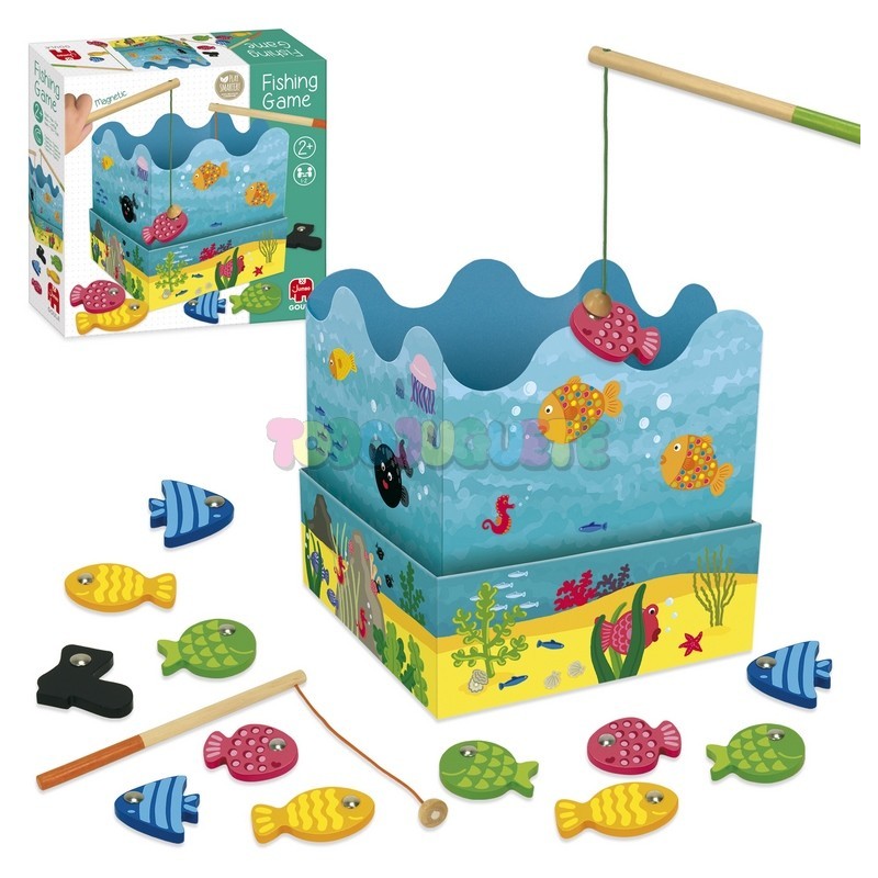 ¡Consigue ser el mejor pescador! Este divertido juego de acción contiene 2 cañas y 12 peces de madera de colores magnéticos que los niños deberán pescar en la pecera que contiene el juego.
