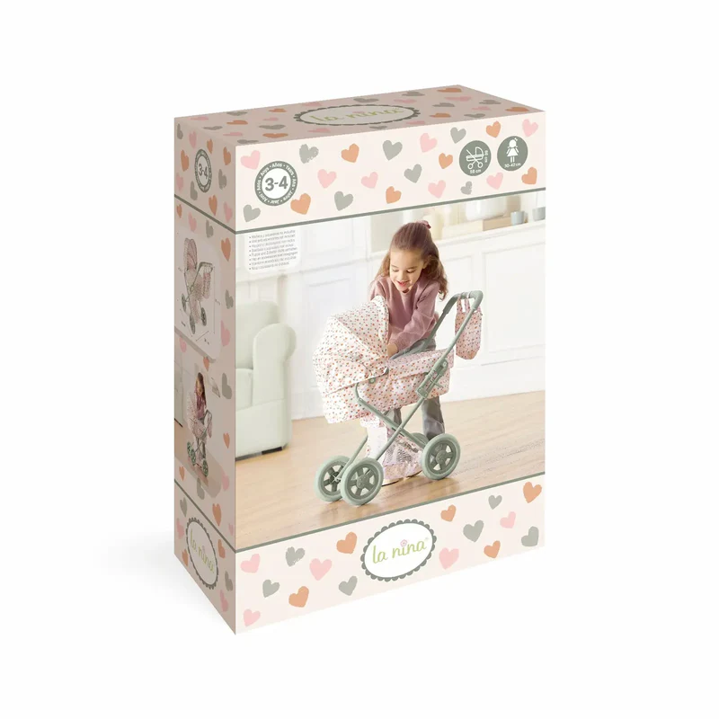 El carrito cuco Amanda es fácil y rápido de montar, con estructura metálica plegable y resistente. Contiene un cómodo manillar y bolso de paseo. Es apto para muñecos de 30 a 42 cm y el capazo, la canastilla y el bolso se pueden lavar a máquina. Altura de 81 cm. Recomendado para niños de 3 a 5 años.