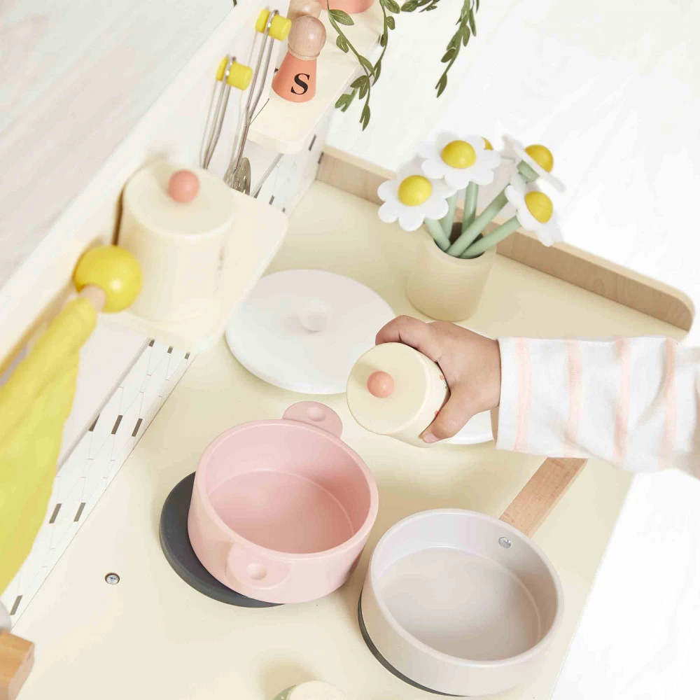 Con su gran cocina de madera, los niños podrán idear deliciosas recetas en los fogones e imitar a los mayores, a partir de 3 años. Equipada como una cocina de verdad y con 16 accesorios, ¡esta cocina de juguete es perfecta para jugar a la comidita e inventar todo tipo de historias y platos! El tamaño de esta cocinita se ha diseñado para ofrecer una gran superficie de juego: mide 77 x 29,5 x 77 cm. El estilo se inspira en la cocina de la abuela, con todos los objetos de siempre que nos siguen encantando: 2 tablas de cortar, 1 sartén, 1 cacerola, 1 espumadera, 1 cucharón, 1 salero y pimentero, 2 especieros, 2 cestas grandes, cortinas, 1 jarrón con 1 ramo de 5 flores, 1 planta verde.