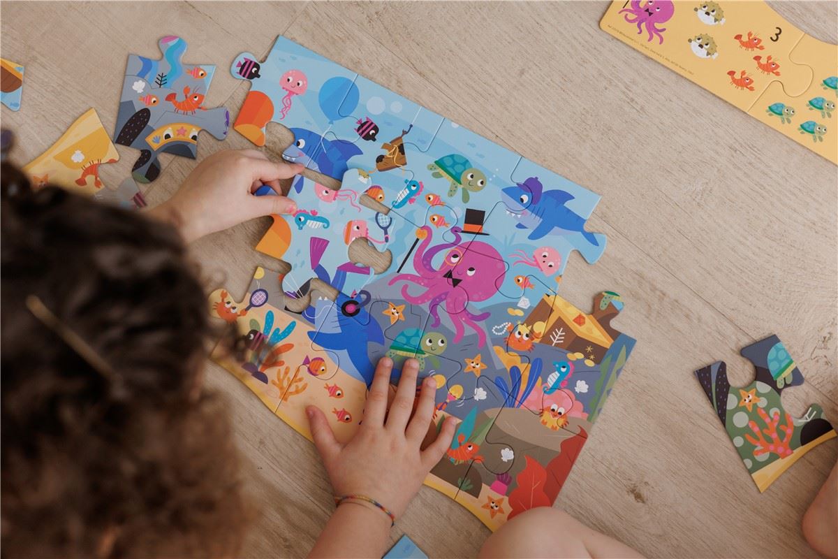 Después de montar el puzzle con un precioso motivo del mar, empieza a contar del 1 al 9 y encuentra los animales marinos correspondientes en la imagen grande. Un juego por descubrir símbolos numéricos y aprende a emparejarlos con el correspondiente cantidades.