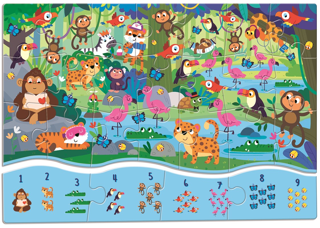 Después de montar el puzzle con un precioso motivo de la jungla, empieza a contar del 1 al 9 y encuentra los animales salvajes correspondientes en la imagen grande. Un juego por descubrir símbolos numéricos y aprende a emparejarlos con el correspondiente cantidades.