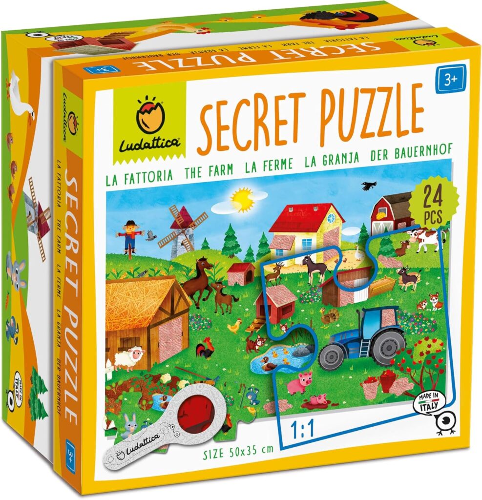 Contiene un puzzle de 24 piezas y una lupa mágica.