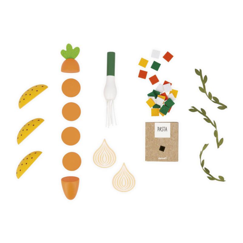 Con este set de sopa, su hijo podrá inventar sus propias recetas mientras aprende a cocinar verduras. Este set está compuesto por 43 accesorios: una olla y un cazo de metal, una batidora para batir las verduras, 6 trozos de zanahoria, 2 cebollas, 3 trozos de patata y un puerro de madera, 3 ramitas de hierbas aromáticas de tela y 24 trocitos de pasta de colores guardados en su caja de cartón. ¡Perfecto para elaborar multitud de sopas adaptándose al gusto de cada uno! Con sus accesorios realistas, este set permitirá a su hijo inventar magníficos platos y hacer como los mayores: crear momentos para compartir alrededor de la mesa.