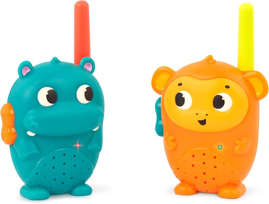 Chatea y diviértete con un par de coloridos walkie-talkies muy fáciles de usar: tienen 1 botón cada uno, ¡sólo tienes que pulsar y hablar!. Tiene una lucecita que indica cuándo pueden hablar o escuchar. El naranja significa que cualquiera puede empezar a hablar, el rojo que tu compañero está charlando y el verde se enciende mientras tú hablas. Estos juguetes clásicos son ideales para juegos de interior y actividades al aire libre, ya que tienen un alcance de 30 metros (en condiciones óptimas).