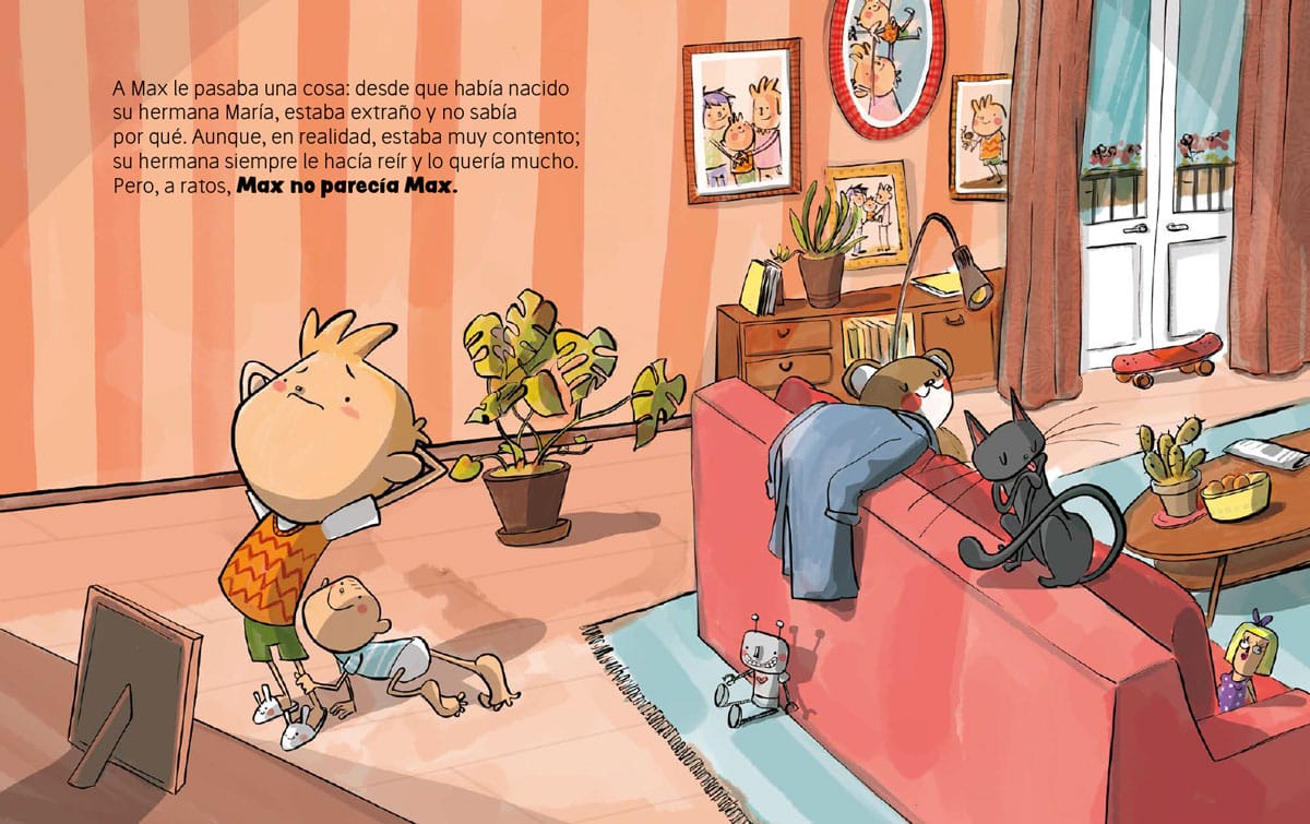 A Max le pasaba una cosa: desde que había nacido su hermana María, estaba extraño y no sabía por qué. Se sentía triste y enfadado (aunque también contento con su nueva hermana). Pero se enfadaba mucho con sus padres. Su madre también se sentía confundida: tener dos hijos era nuevo para ella. Cada día la situación era más preocupante, hasta que, de repente, PUM, apareció el señor Malestar, un duende con sombrero y maletín, que les ayudará a detectar qué les pasa y a conectar de nuevo.