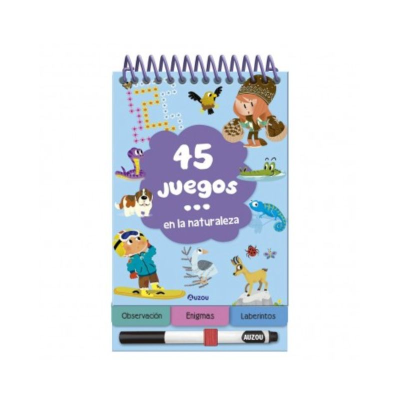 45 juegos es una colección de libro-juegos en un práctico formato pequeño con un rotulador borrable ¡para divertirse por todas partes y todo el tiempo! 45 juegos alrededor de un momento o situación (de vacaciones, de viaje, mientras esperas, en la ciudad, en la naturaleza, en compañía de dinosaurios…) divididos en 3 secciones: 15 juegos de observación (busca y encuentra, juegos de sombras, juegos de las 7 diferencias, intruso, juego de parejas…), 15 enigmas (sudoku, crucigramas, sopas de letras, juegos de deducción, unir puntos, juegos gráficos, juegos de cálculo) y 15 laberintos. Con 5 páginas de soluciones al final.