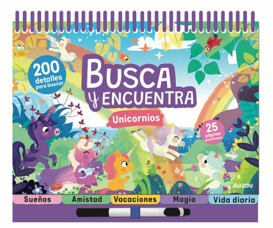 ¡Disfruta durante horas! Con este original e ingenioso libro, ¡busca y encuentra: 10 elementos en cada página y 1 mariposa escondida en todas! Este bloc con anillas cuenta con 5 pestañas: campo, ciudad, mundo, granja y agua. También incluye soluciones claras que puedes consultar y esconder fácilmente gracias a las anillas, y ¡un rotulador borrable de regalo! para jugar una y otra vez.Este libro es muy práctico para llevar a todas partes gracias al rotulador especial y a las páginas plastificadas, y los niños y niñas pueden repetir la búsqueda tantas veces como quieran. Todas las páginas contienen alegres ilustraciones con diferencias, separados en 5 temáticas mediante pestañas. ¡Más de 150 diferencias que buscar! Incluye rotulador borrable y encuadernación en espiral para escribir y dibujar cómodamente, ¡es directamente un juego de viaje! Perfecto para entretener en cualquier sitio, mientras estimulan la memoria, la concentración, la lógica, la creatividad… ¡Cada página es un nuevo juego!