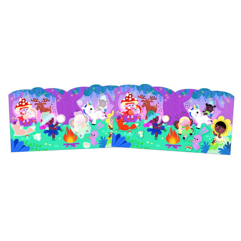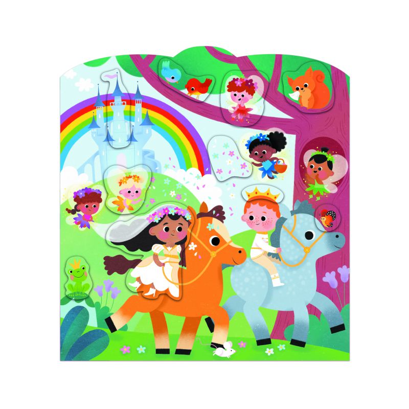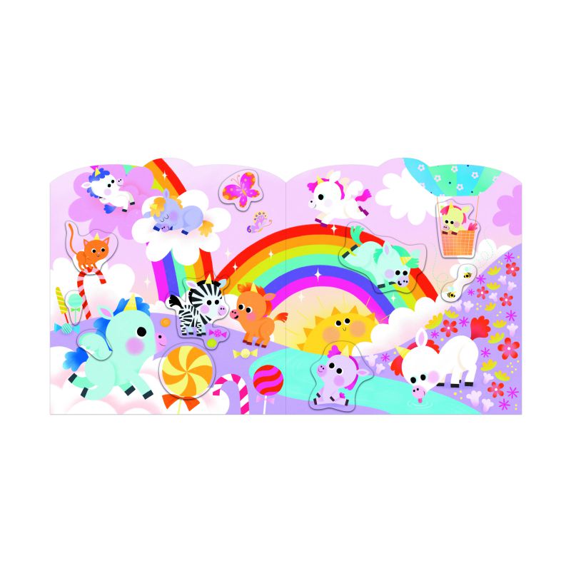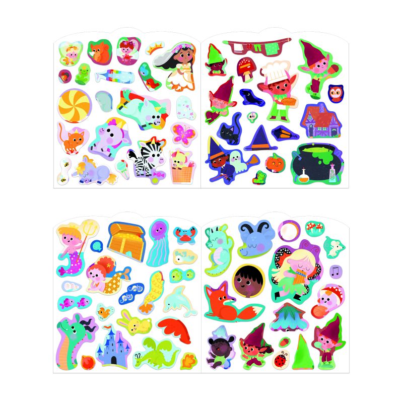 12 páginas con decorados ilustrados inspirados en mundos mágicos de unicornios o princesas para completarlos con las 8 páginas de pegatinas, que contienen 70 en total. Para ayudar al niño a encontrar la ubicación de cada pegatina, están marcadas en color atenuado. Las pegatinas son de formas sencillas para facilitar su agarre y no tienen bordes. Se pegan y despegan fácilmente y vienen en unas láminas grapadas al cuaderno.