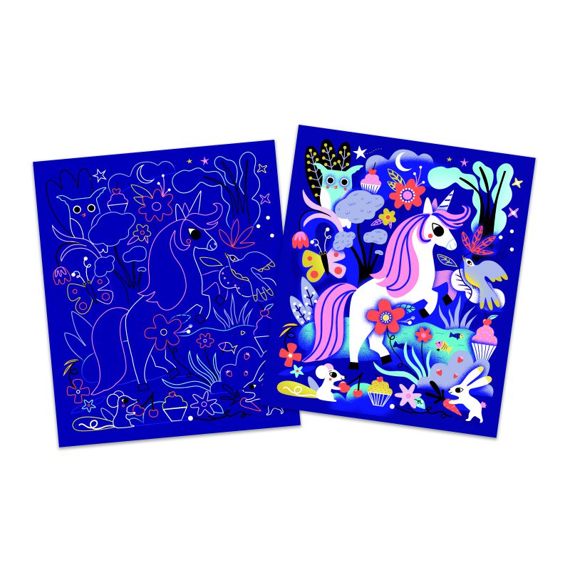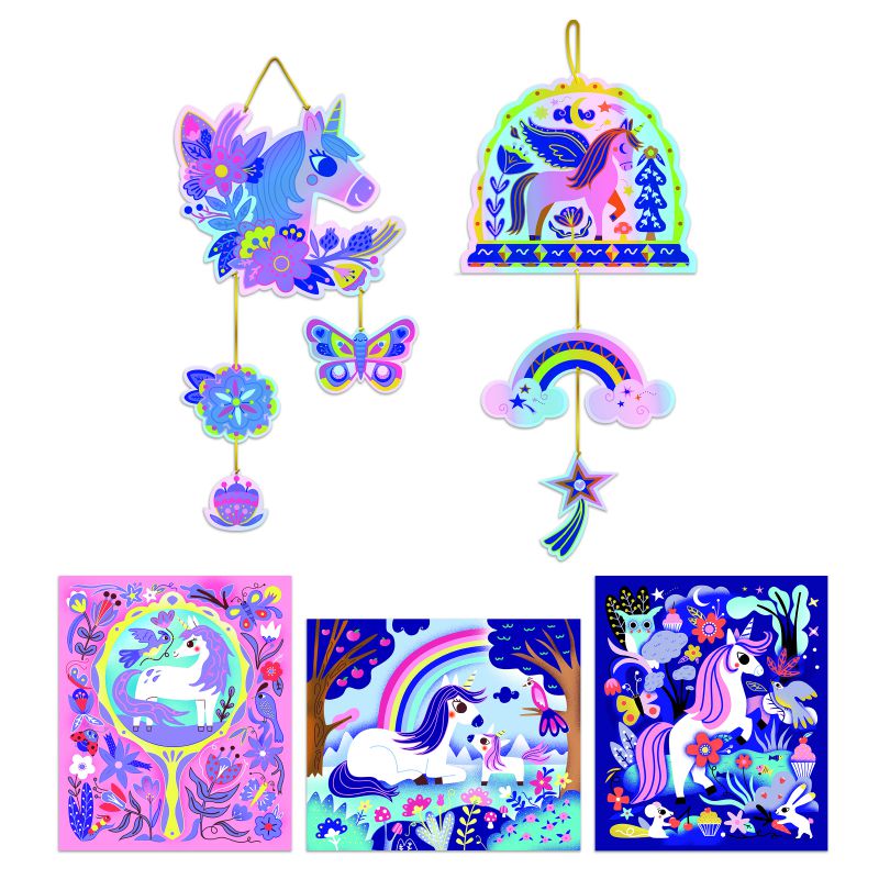 2 móviles holográficos y 3 cuadros de unicornios! Contiene hilo, una herramienta de madera para rascar, 2 cuadros precortados holográficos impresos en PET con tinta para rascar y 3 cuadros impresos en 4 colores. ¡El espectacular efecto irisado holográfico está garantizado! Esta actividad requiere alrededor de 1 hora y 10 minutos, permite desarrollar la paciencia y es ideal para niños a partir de 6 años.