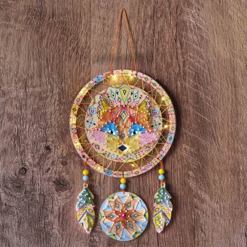 ¡Nada de pesadillas con este precioso zorro! Con este kit creativo, los niños a partir de 8 años podrán realizar un bonito y luminoso atrapasueños utilizando la técnica del hilo tensado. Además de ser una bonita decoración para su dormitorio, el atrapasueños zorro tranquilizará a los niños, ¡para que puedan dormir toda la noche sin pesadillas! ¿Su pequeño extra? Se ilumina gracias a la guirnalda de LED incluida. Otra forma estupenda de tranquilizarlos por la noche. Esta actividad creativa utiliza el arte de las cuerdas en un estilo natural. Es una actividad que desarrolla la creatividad y la paciencia de los niños, ¡y da como resultado una bonita obra para mostrar con orgullo! Este paquete de decoración creativa contiene: 2 tableros con formas de espuma precortadas, 300 clavos de plástico, 10 madejas de hilo de algodón de 10 colores diferentes (7 metros), 1 cuerda de yute (3 metros), 6 cuentas y 1 luz de cuerda (pilas incluidas). También se incluye un folleto con el patrón y las instrucciones, para guiar a los más pequeños paso a paso por la actividad. Tardarás unas 2 horas en hacer este atrapasueños con alambres tensados. Regala esta caja a un pequeño amante de la naturaleza, a un aficionado a la decoración o a un artista en ciernes.