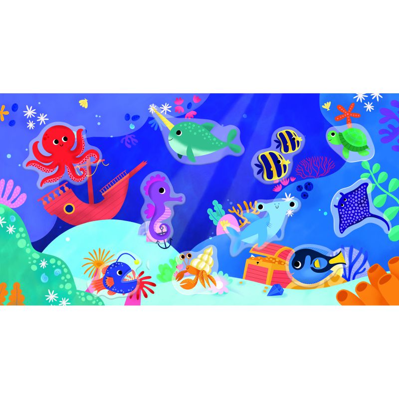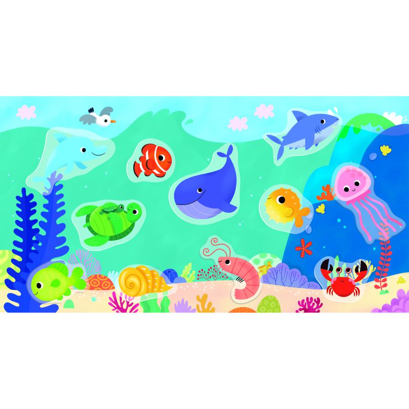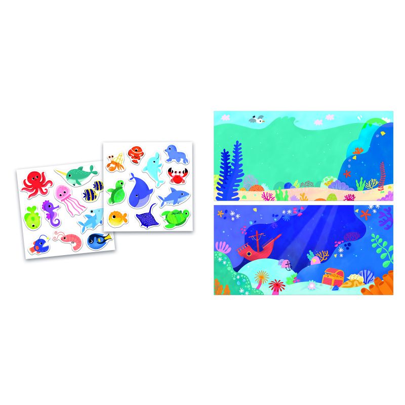reposicionables en un decorado de doble cara: una con el fondo del mar diurno y la otra nocturno. Las pegatinas tienen una base transparente para integrarse en el decorado. El estuche contiene 1 decorado reversible y 2 láminas de pegatinas gruesas reposicionables sin límite. Si dejan de pegar, solo hay que mojarlas para seguir jugando durante horas.