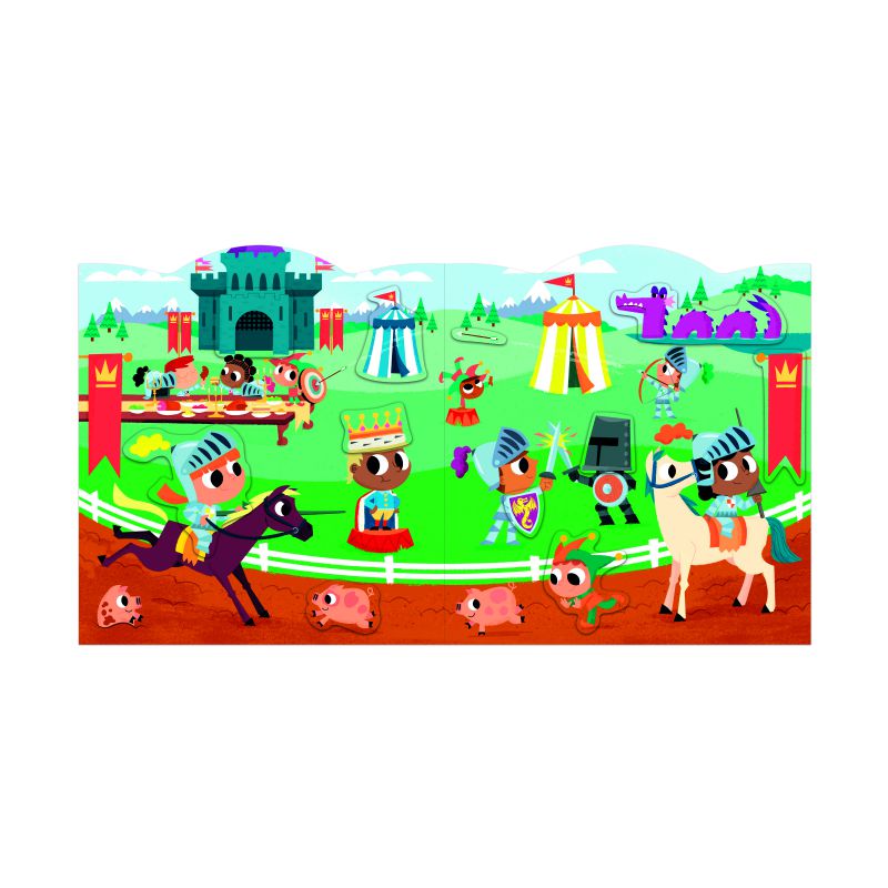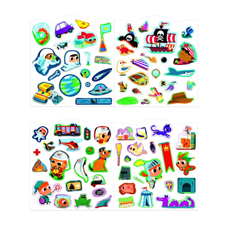 decorados ilustrados inspirados en aventureros como astronautas, piratas o bomberos para completarlos con las 8 páginas de pegatinas, que contienen 70 en total. Para ayudar al niño a encontrar la ubicación de cada pegatina, están marcadas en color atenuado. Las pegatinas son de formas sencillas para facilitar su agarre y no tienen bordes. Se pegan y despegan fácilmente y vienen en unas láminas grapadas al cuaderno. Esta actividad permite desarrollar la paciencia y la motricidad fina. Es ideal para niños a partir de 3 años.