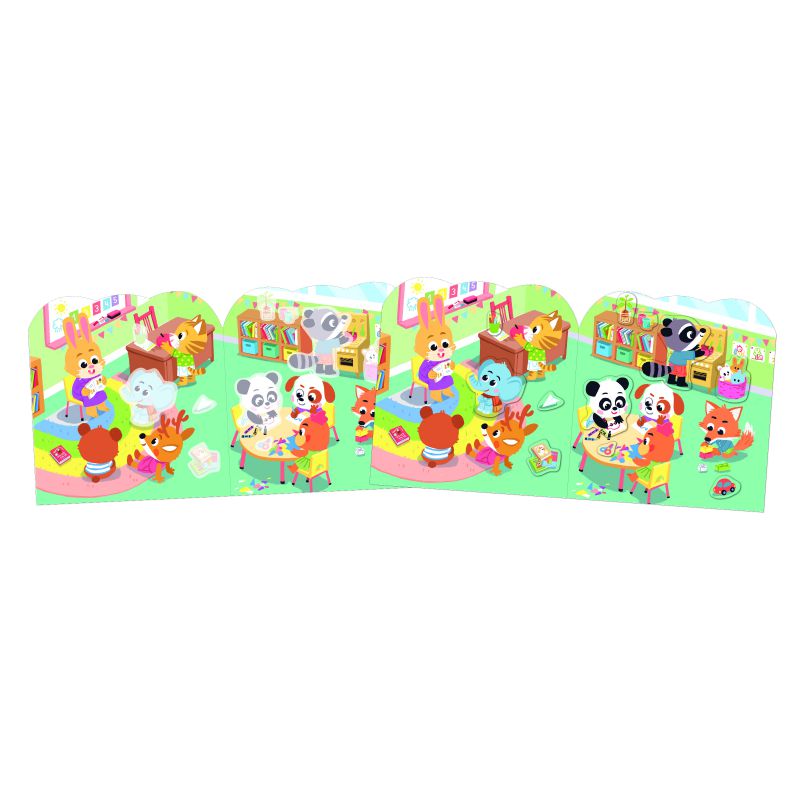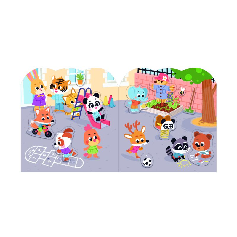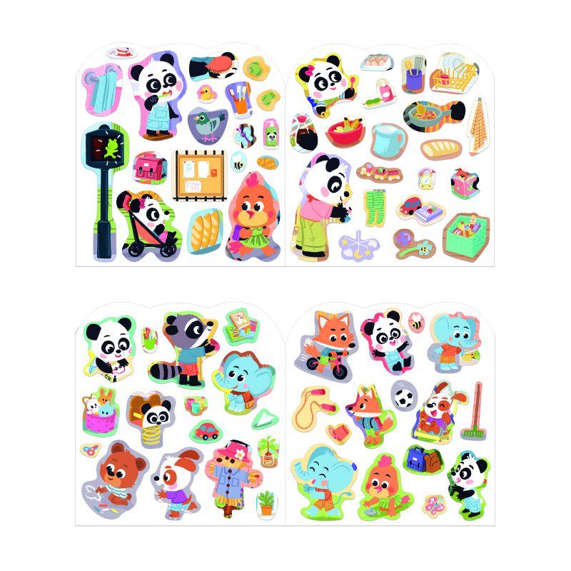 Con decorados ilustrados inspirados en el transcurso de un día (ir al cole, jugar en clase) para completarlos con las 8 páginas de pegatinas, que contienen 70 en total.