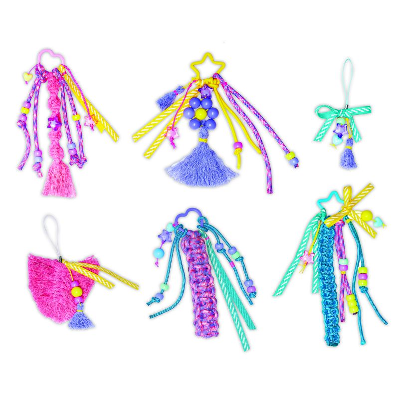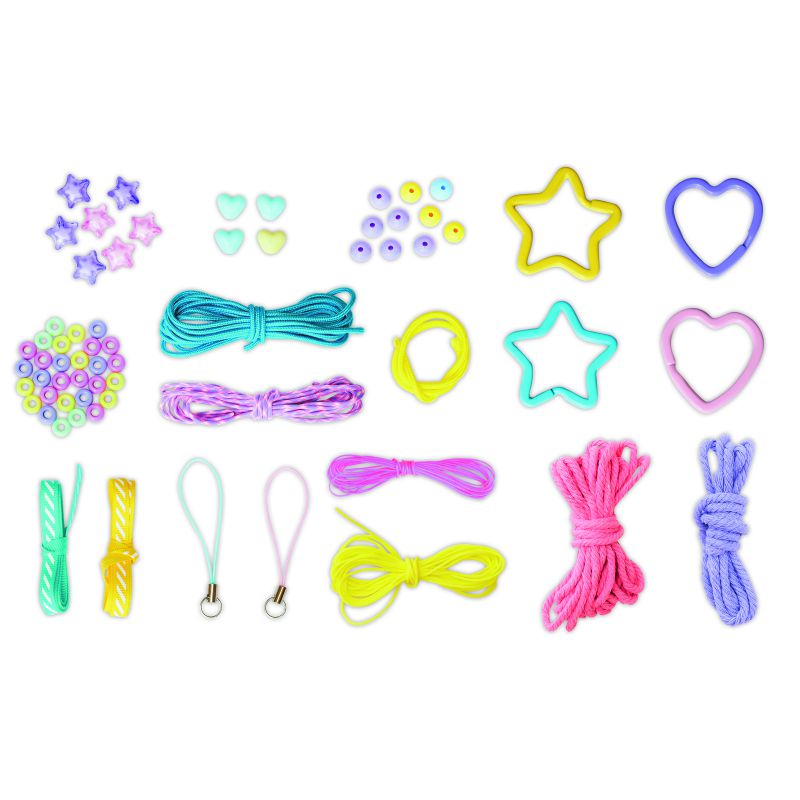 Contiene 7 cuentas de estrellas, 29 abalorios grandes de colores, 4 cuentas acrílicas de corazón, 10 cuentas redondas, 3 hilos de macramé trenzados (amarillo, turquesa y bicolor, violeta, rosa claro), 2 cordones (violeta y rosa), 2 cintas impresas, 2 hilos de jade (amarillo y rosa intenso), 2 anillas de llavero en forma de estrella, 2 anillas de llavero en forma de corazón y 1 folleto con instrucciones y modelos.