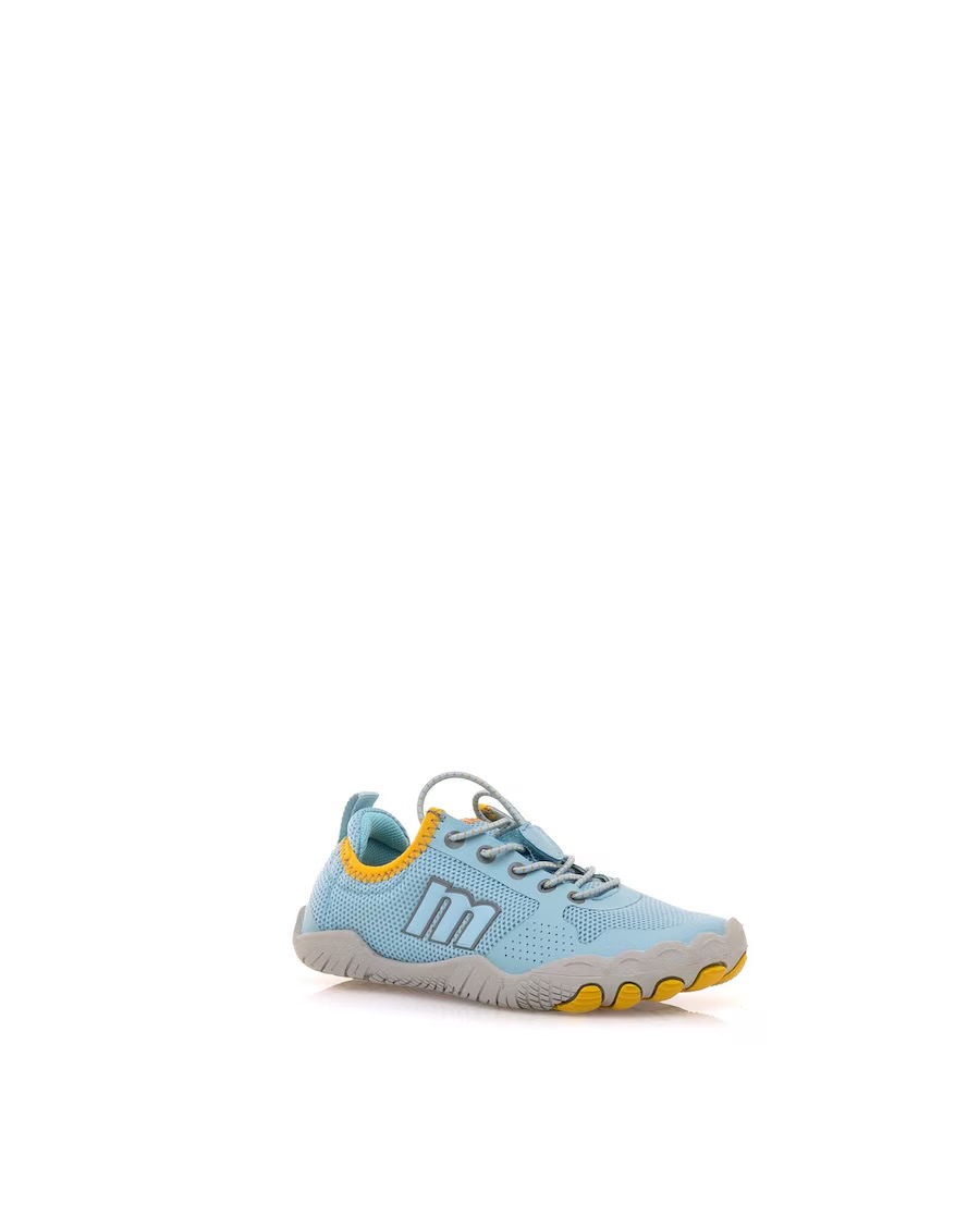 Zapatillas estilo deportiva de color azul claro para niño, modelo Scarpo de Mustang con detalles en amarillo. El corte en malla ofrece una buena transpiración, mientras que los cordones elásticos ajustables con tope permiten un calce rápido y seguro. La suela con forma de deditos con refuerzo en la puntera aporta comodidad. Con certificado VEGANO sellado por INESCOP, el cual garantiza que la naturaleza química principal del material no se corresponde con fibras de origen animal.