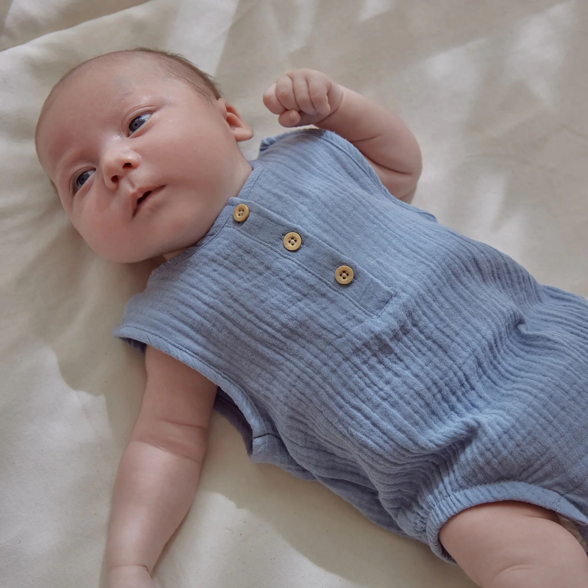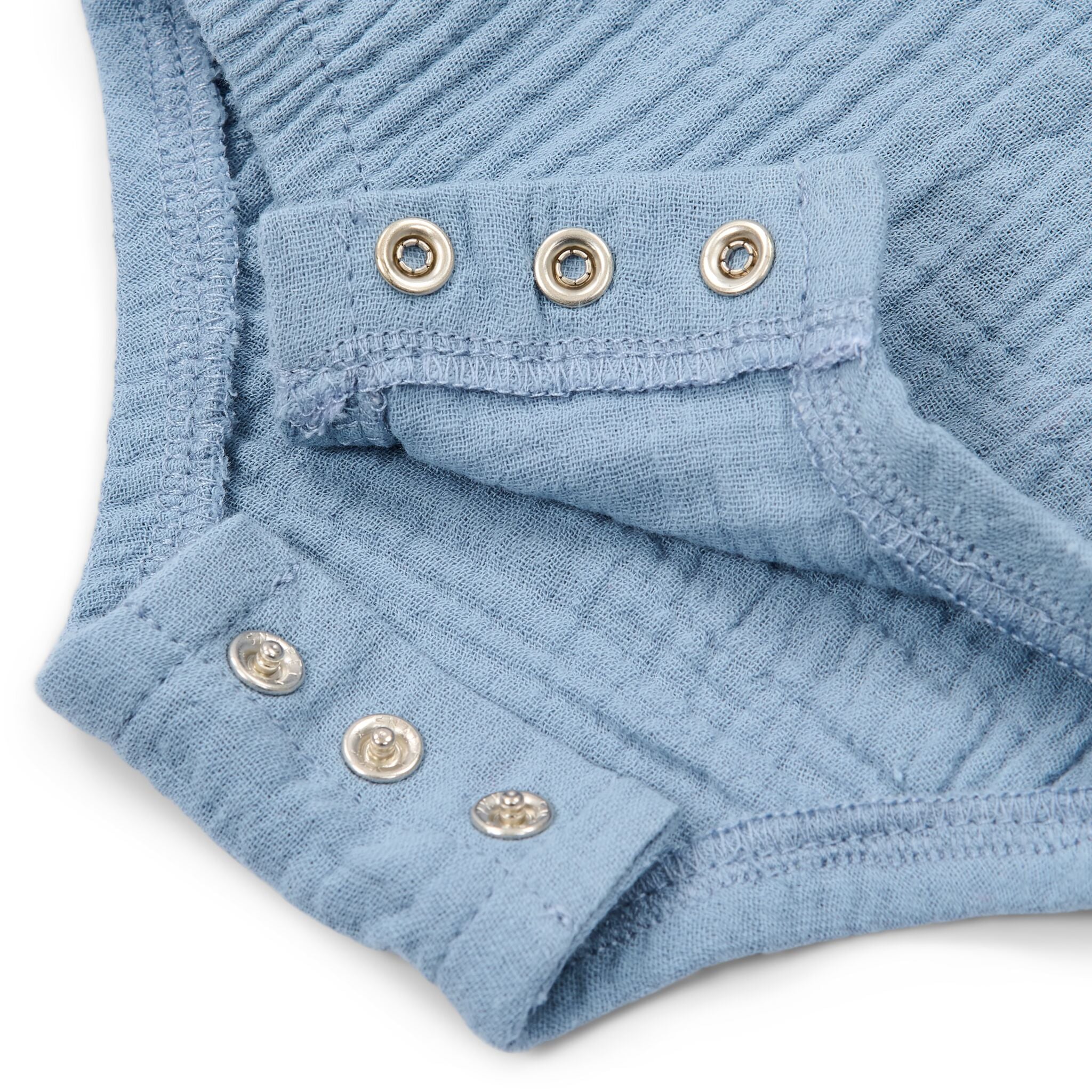Este mono sin mangas en azul claro es maravillosamente fresco para los días cálidos. Confeccionado en muselina ligera y algodón orgánico, resulta muy suave al tacto. Los botones con aspecto de madera y su bonito estampado lo hacen único. Perfecto para moverse con total libertad y fácil de poner y quitar gracias a los botones a presión.