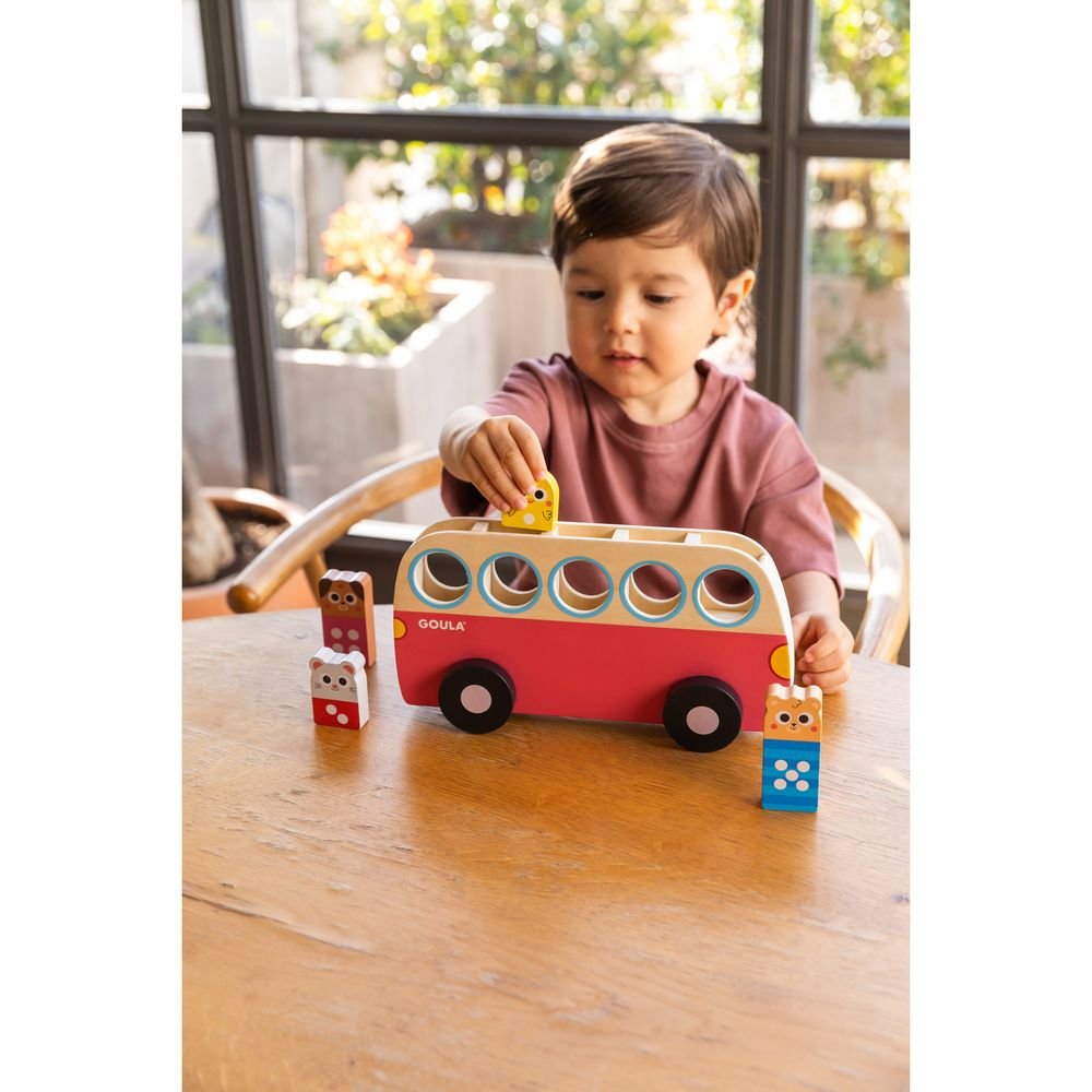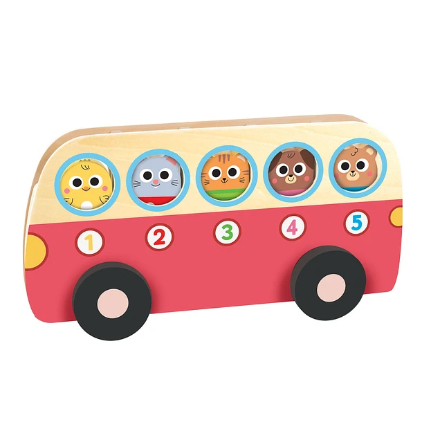 Este juguete ayuda a los niños a aprender a contar del 1 al 5. Incluye piezas de madera con animales para colocar en el autobús, con un sistema autocorrectivo que fomenta el juego individual.