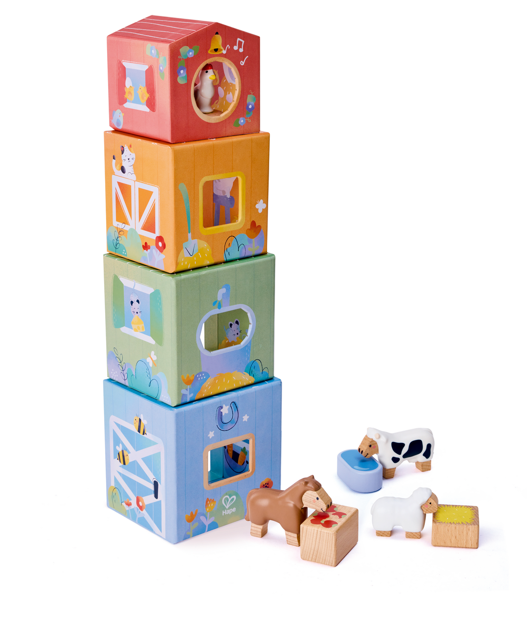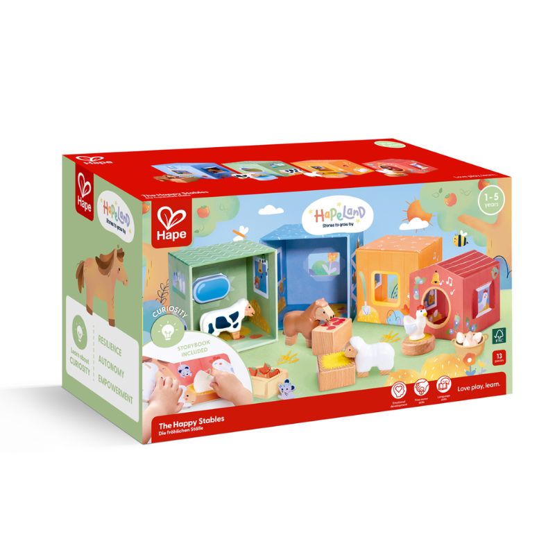 - UNA GRANJA LLENA DE INSPIRACIÓN: Este set de Hape Land incluye 4 cajas apilables y encajables, 4 animales de granja y accesorios, además de un cuento ilustrado. .