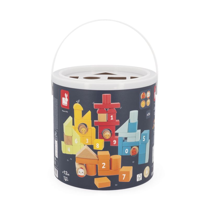 Apilar, construir, imaginar… Le presentamos un barril de 56 piezas de varios colores, con la temática de la granja, para desarrollar la motricidad fina de su hijo. Equipado con una tapa con el corte de las piezas, se convierte en una caja de formas para guardarlo todo en el barril divirtiéndose. Por último, su hijo encontrará en él círculos, cuadrados, triángulos, y también puentes e ilustraciones (gallina, gallo y pollitos) para desarrollar su imaginación. La numeración de los cubos del 0 al 9 permitirá a los niños más mayores aprender a contar. Juguete de madera FSCTM. Juguete de estimulación para niños a partir de 12 meses.