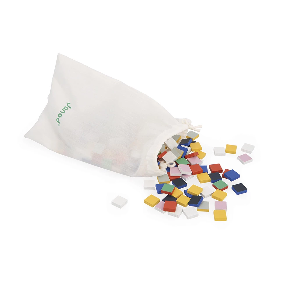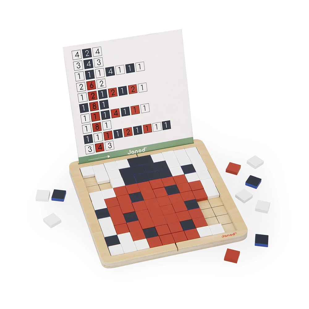 Pieza a pieza, ¡aparecen las formas! Con este juego educativo, los niños a partir de 5 años pueden convertirse en expertos en codificación y simetría. Consta de un tablero de madera de 17,6 x 17,6 cm, 200 fichas de madera, 10 tarjetas modelo y una bolsa de almacenamiento. Este juego educativo tiene 4 modos de juego diferentes. Superposición: los niños colocan una tarjeta modelo en el tablero y colocan las fichas encima; Reproducción: los niños colocan la tarjeta modelo en la muesca del tablero, frente a ellos, y colocan los elementos en el tablero; Simetría: los niños colocan media tarjeta en el tablero y reproducen el patrón por simetría en la otra mitad; Codificación: los niños siguen los números y colores indicados en la tarjeta para reproducir y descubrir la ilustración en el tablero. Apto para todos los niveles de progreso, este juego de simetría y codificación ayuda a desarrollar la concentración, la capacidad de observación, la lógica y el reconocimiento de números y colores. Puede jugar a este juego educativo de madera con niños pequeños, en grupo, de forma independiente o acompañado de un adulto. Las piezas facilitan la creación de figuras pixeladas, ¡perfectas para niños de guardería! Este juego educativo para aprender codificación y simetría está fabricado con madera y cartón con certificación FSC™. Forma parte de la gama educativa Janod, desarrollada en colaboración con un profesor de escuela para ceñirse lo mejor posible al aprendizaje y a los programas de cada nivel.