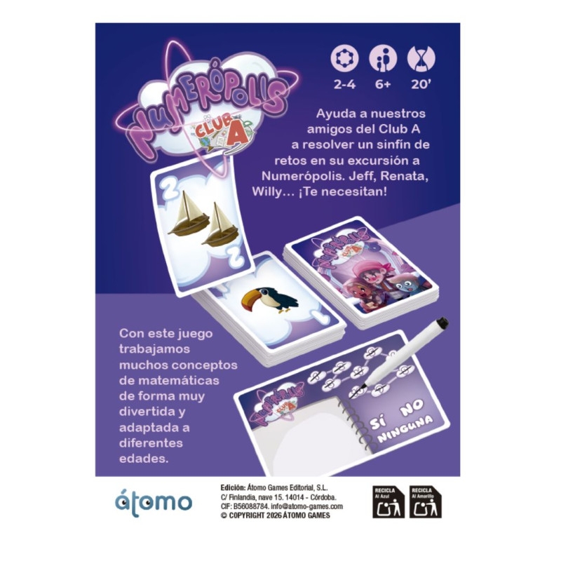 Club A: Numerópolis es un juego de cartas para niños en el que tendréis que acompañar a tus amigos del Club A a una excursión por Numerópolis, donde vivirán un sinfín de aventuras matemáticas. ¡No te lo puedes perder!