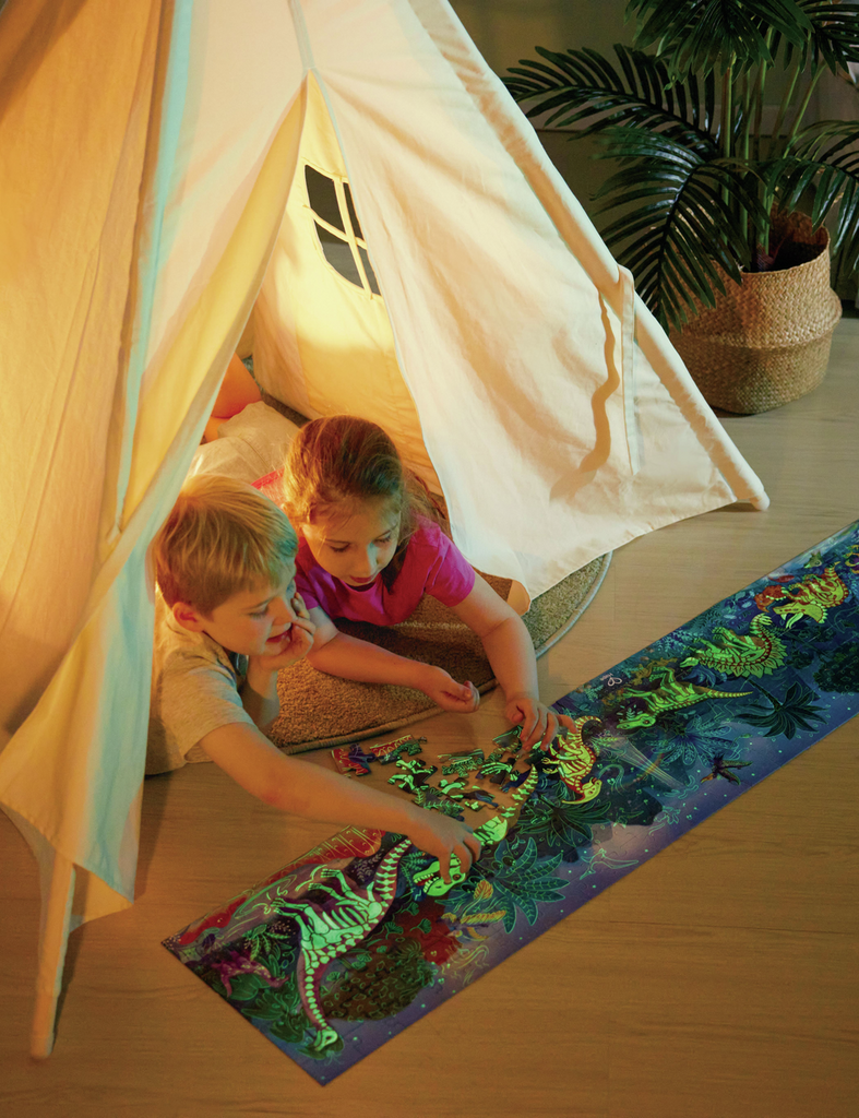 - El rompecabezas incluye dinosaurios en un entorno místico, cuyos esqueletos brillan en la oscuridad.