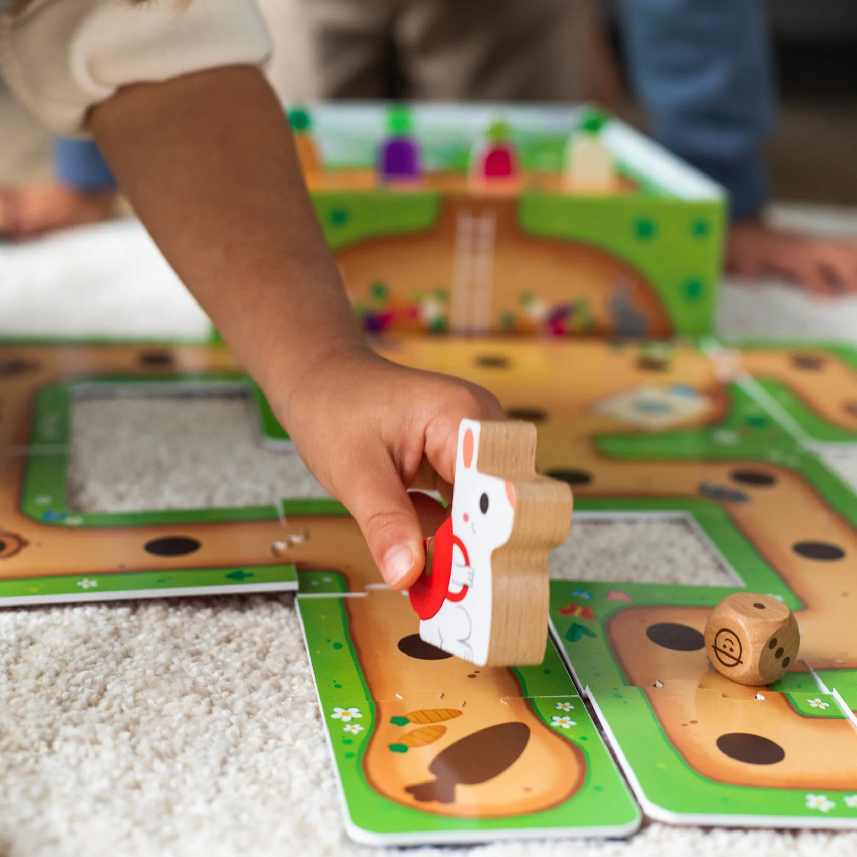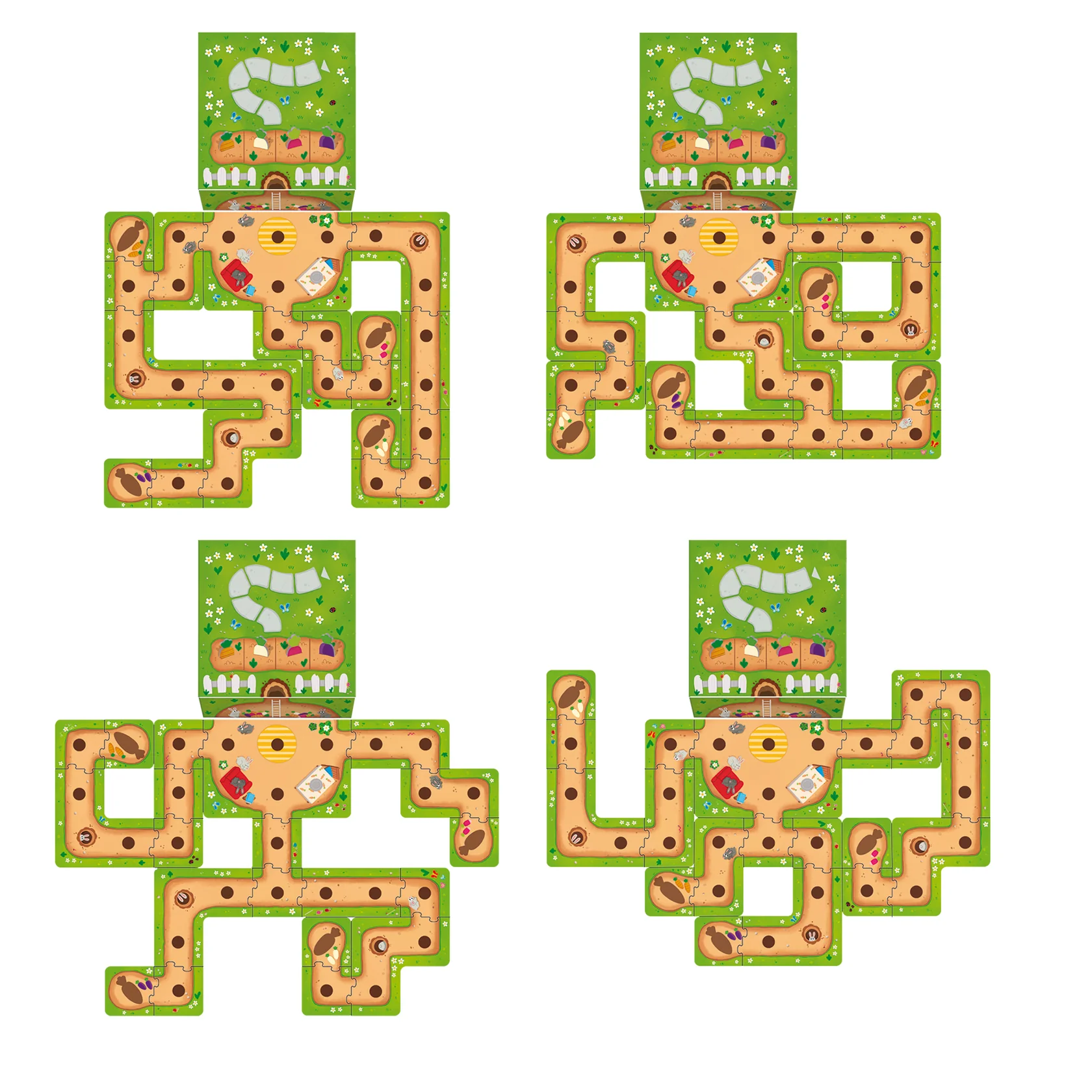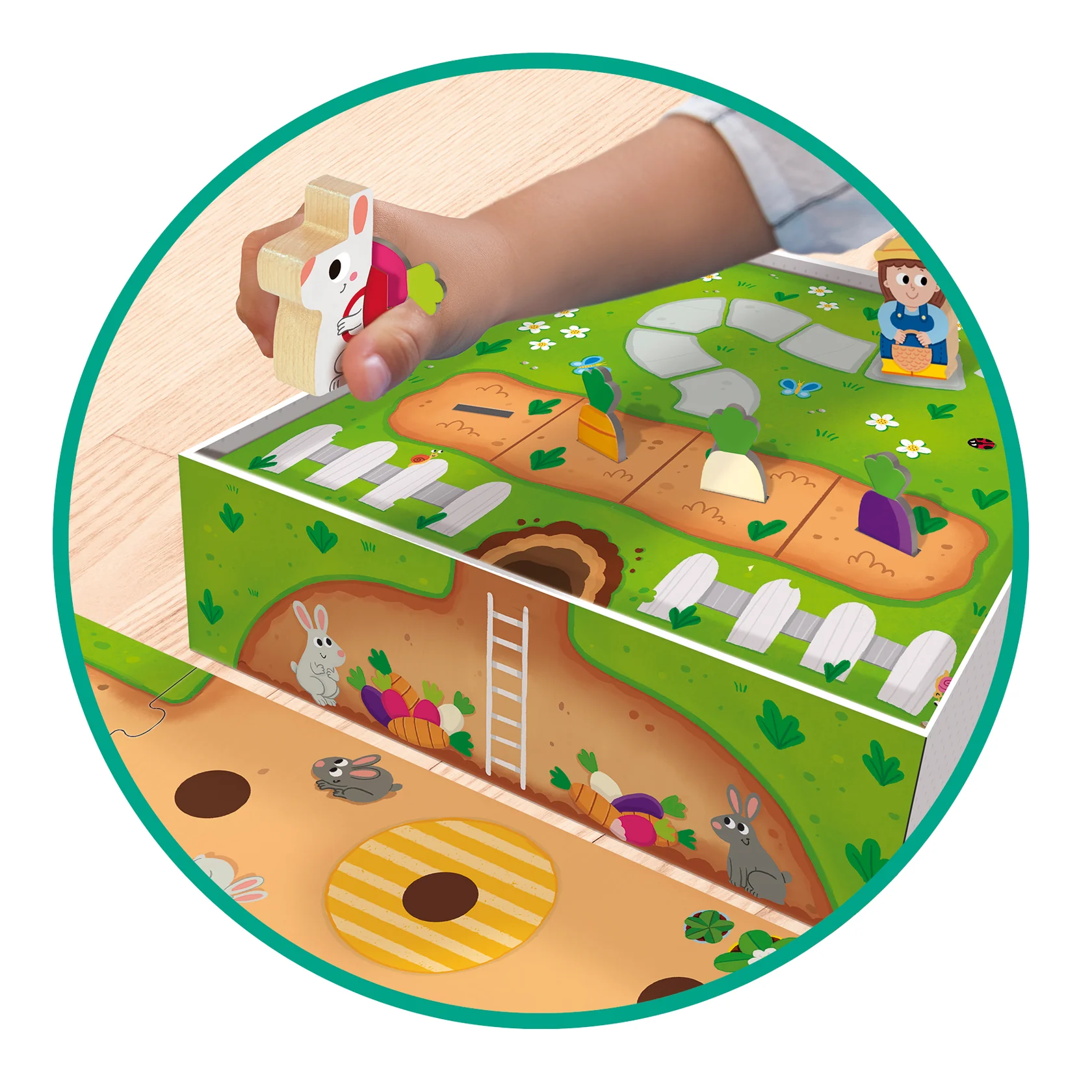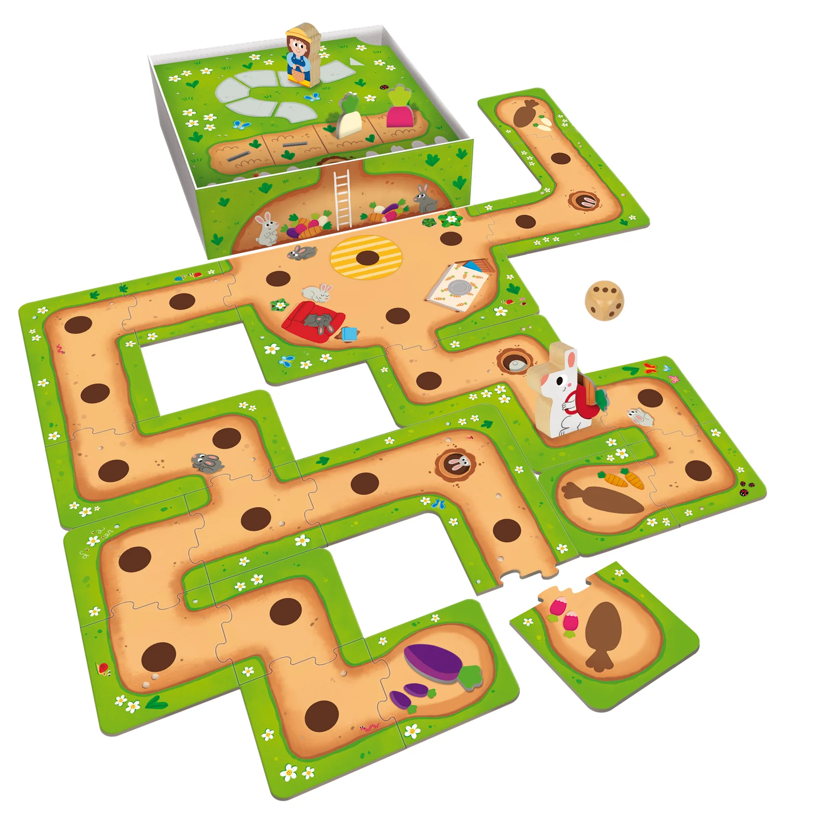 Juego de mesa preescolar cooperativo que consiste en ayudar al conejito a construir una madriguera y a llenar las despensas de verduras antes de que el granjero lo descubra. El niño podrá jugar cada vez de manera distinta ya que el recorrido del conejito es un puzle y lo puede construir de muchas maneras distintas. La caja forma parte del juego y es el recorrido para el granjero.