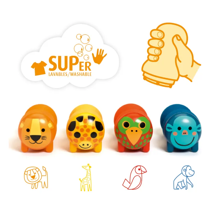 Tu peque lo pasará genial, al tiempo que ejercita su coordinación mano-ojo, estampando estos animalitos. El mango de espuma está especialmente diseñado para manitas pequeñas y los sellos autoentintados se marcan fácilmente.