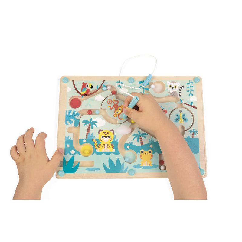 ¡Bienvenidos a la selva! Un lugar lleno de animales exóticos. Su hijo tendrá que atravesar el laberinto para repartir las 12 bolitas de colores a los animales correctos, usando el lápiz magnético. ¡Cuidado con las trampas! Tendrás que pasar por la puerta giratoria para escapar del mono y la mariposa.
