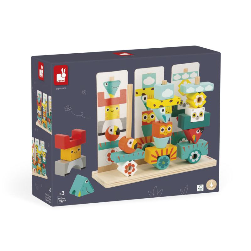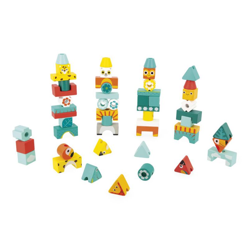¡Venid a conocer los distintos tótems de la selva tropical! Con 52 piezas de madera y 6 tarjetas impresas por ambos lados, el niño podrá reproducir los 12 modelos propuestos o dar rienda suelta a su imaginación creando sus propios y originales tótems. En las coloridas piezas el niño descubrirá, bien escondidos, a los animales de la selva, como el mono, el loro o el cocodrilo.